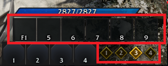 On the left side of the Identity, you can find your health bar and eight skills. On the right side, we have our mana bar and our set of consumables (potions, grenades, etc.), and other shortcuts to mounts, pets, songs, etc. You can also see the many active buffs on your character (usually outlined in green).